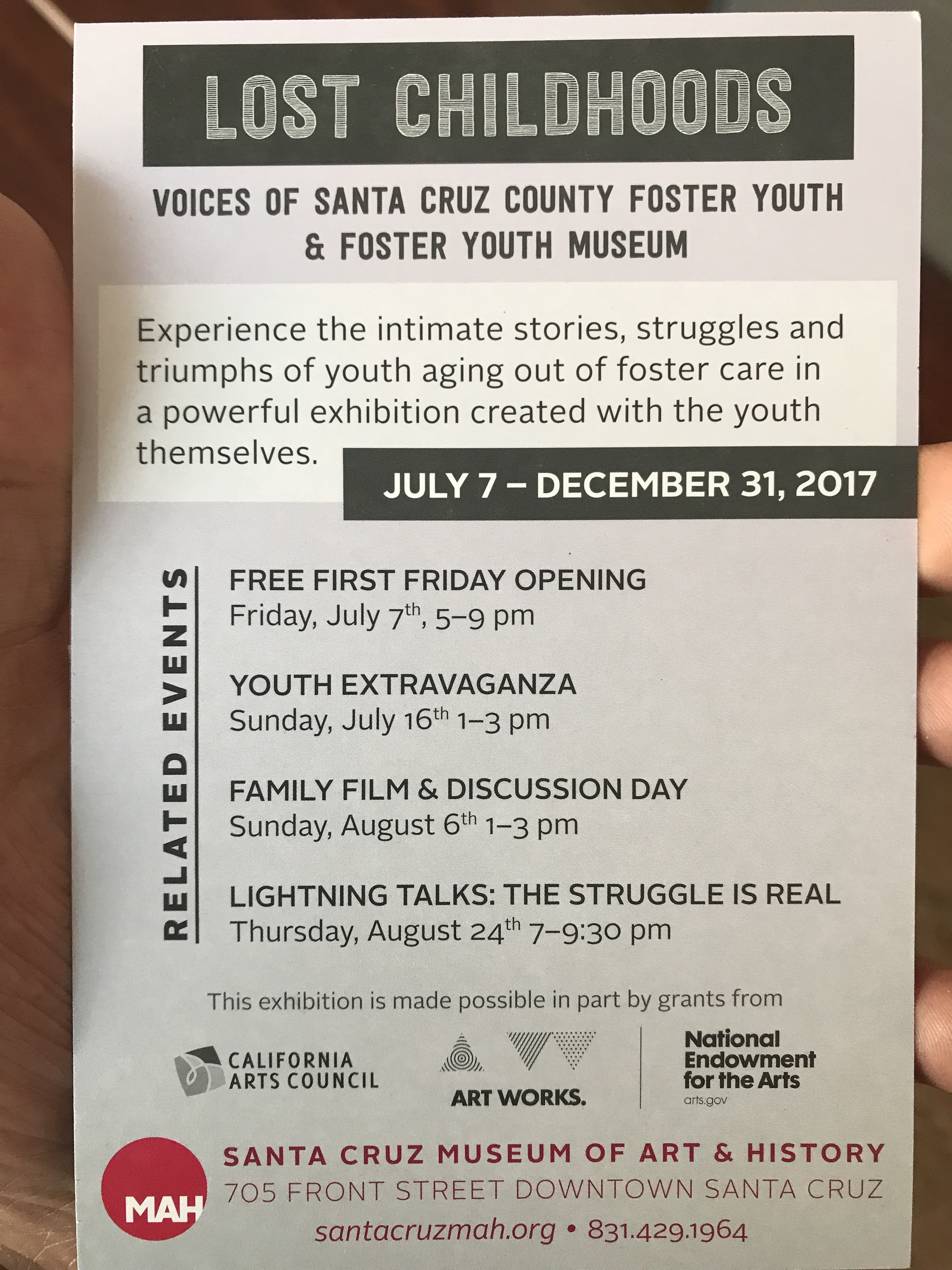 Come one! Come ALL!! Come Join us for opening Night of the Lost Childhoods Exhibition for FREE during First Friday on July 7, 2017 at the Santa Cruz Museum of Art & History.